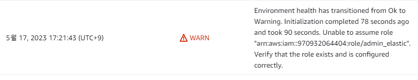 Environment health has transitioned from Ok to Warning. Initialization completed 78 seconds ago and took 90 seconds. Unable to assume role "arn:aws:iam:: 0000000000:role/역할이름". Verify that the role exists and is configured correctly.